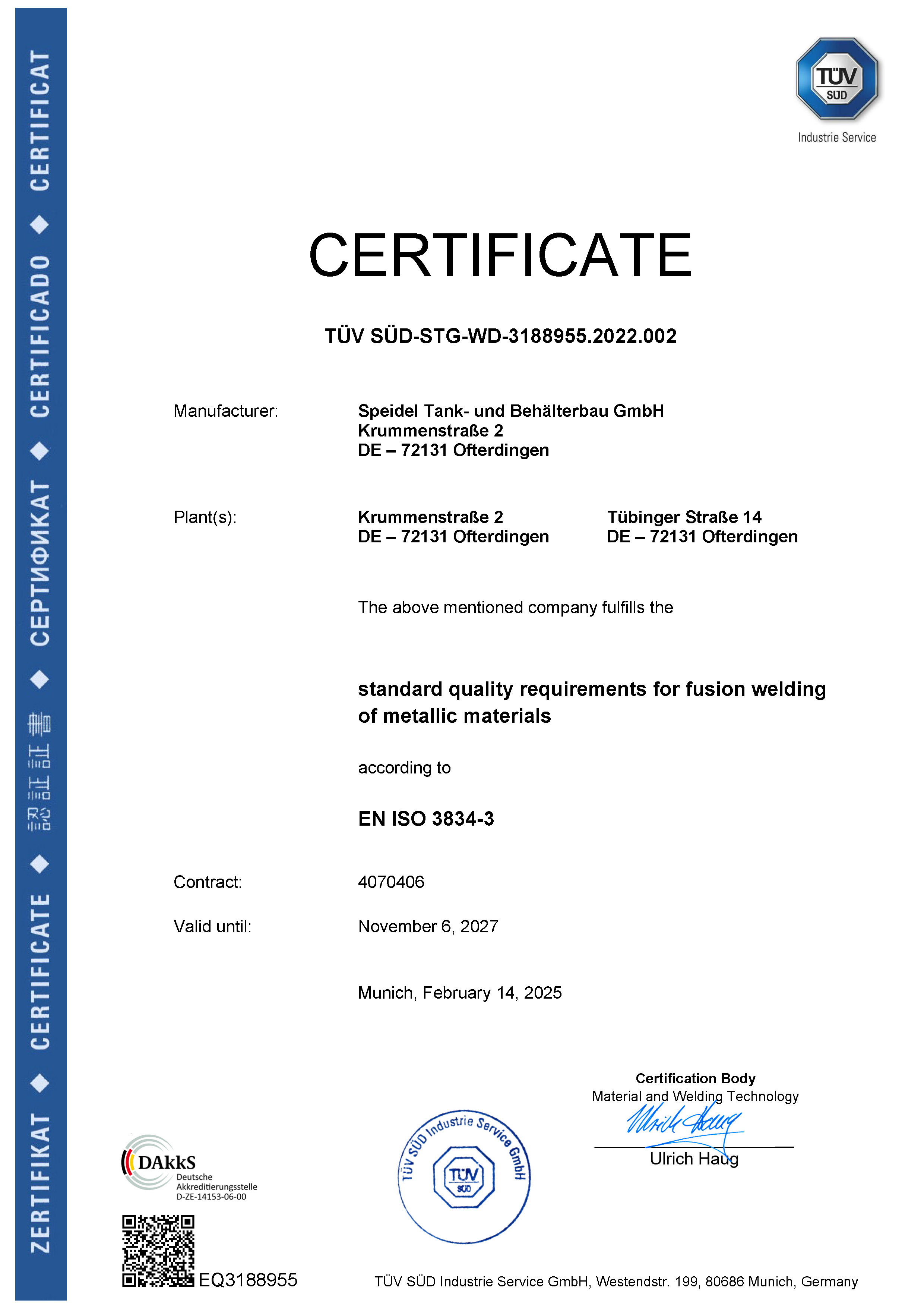 - DIN EN ISO 3834-2 quality requirements for fusion welding of metal material